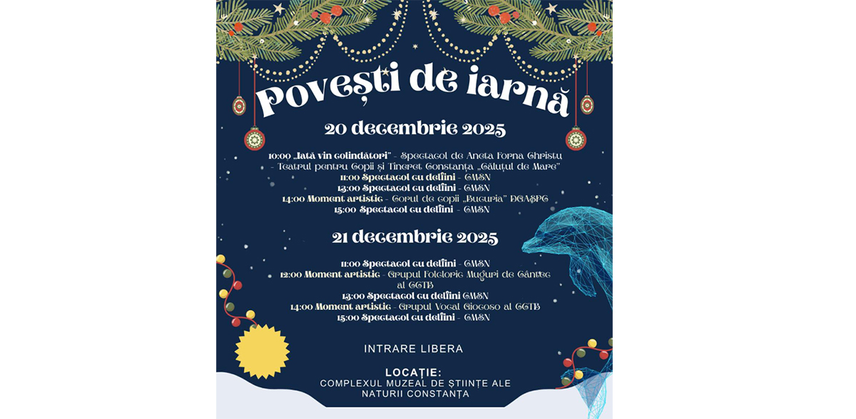 „Vă invităm să petreceți un weekend magic alături de cei mici, plin de colinde, spectacole și momente artistice deosebite, într-o atmosferă de poveste! Vă așteptăm cu bucurie, colinde și surprize pentru întreaga familie! Nu ratați un eveniment de suflet dedicat copiilor și spiritului sărbătorilor!”, transmit reprezentanții CJC. Programul este următorul: Sâmbătă, 20 decembrie 2025 Duminică, 21 decembrie 2025 Citește și: Moș Crăciun Scafandru ajunge în Portul Militar Constanța: Când îl pot întâlni cei mici
