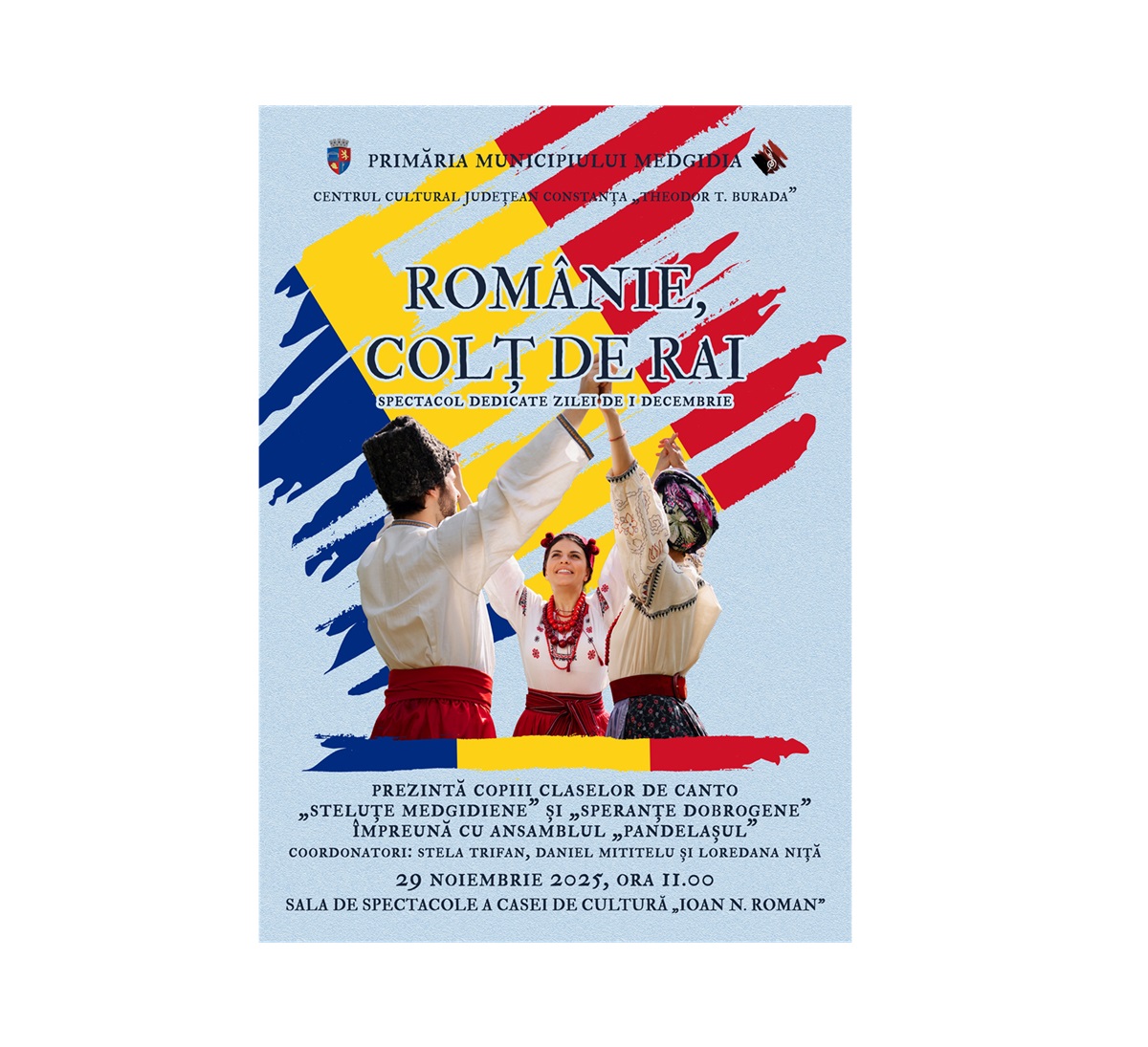 Vineri, 29 noiembrie 2025, începând cu ora 11.00, Sala de spectacole a Casei de Cultură „Ioan N. Roman” din Medgidia va fi gazda unui eveniment special. Pe scenă vor urca micii artiști din clasele de canto „Steluțe Medgidiene” și „Speranțe Dobrogene” cu un repertoriu dedicat spiritului românesc.